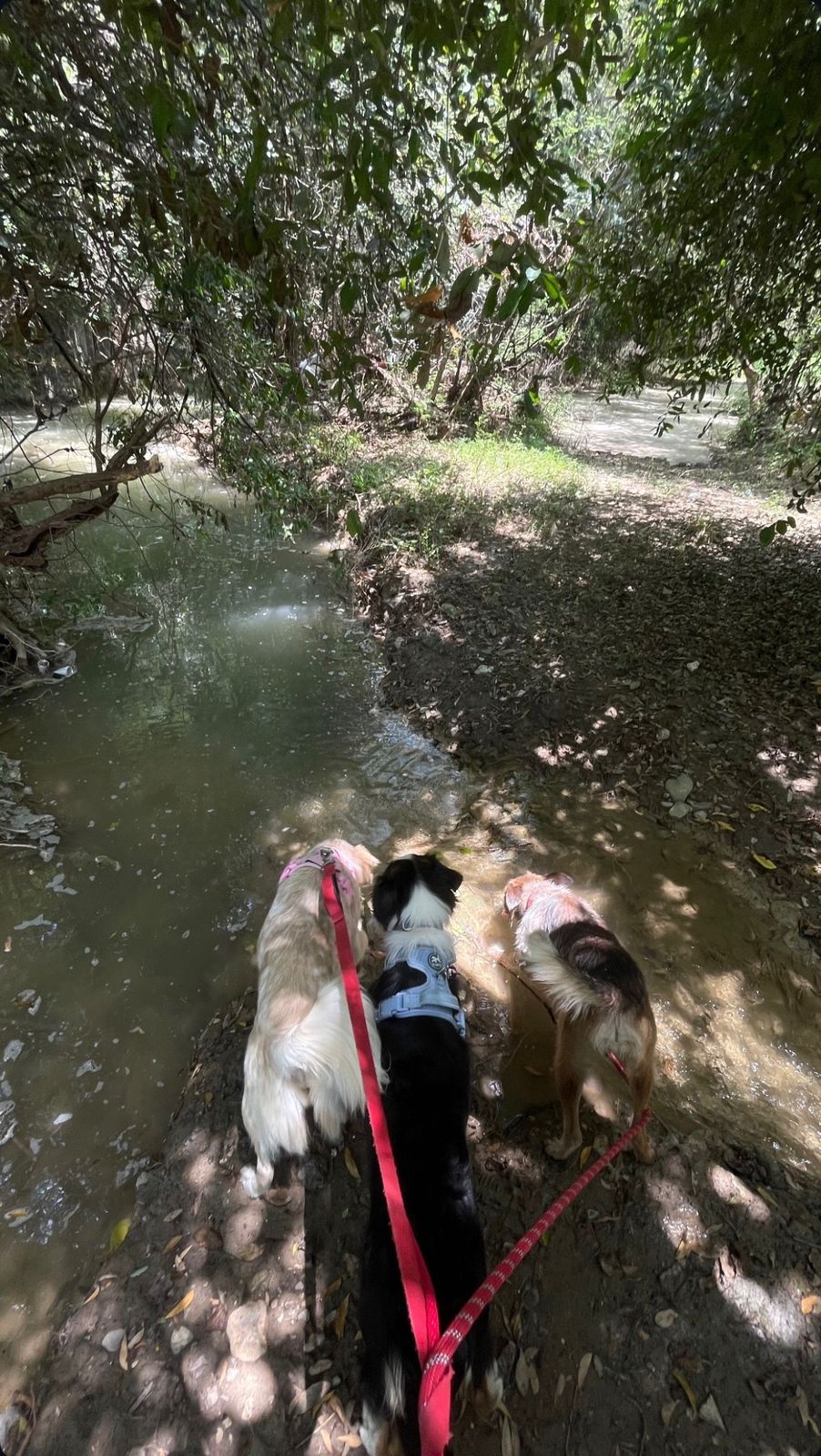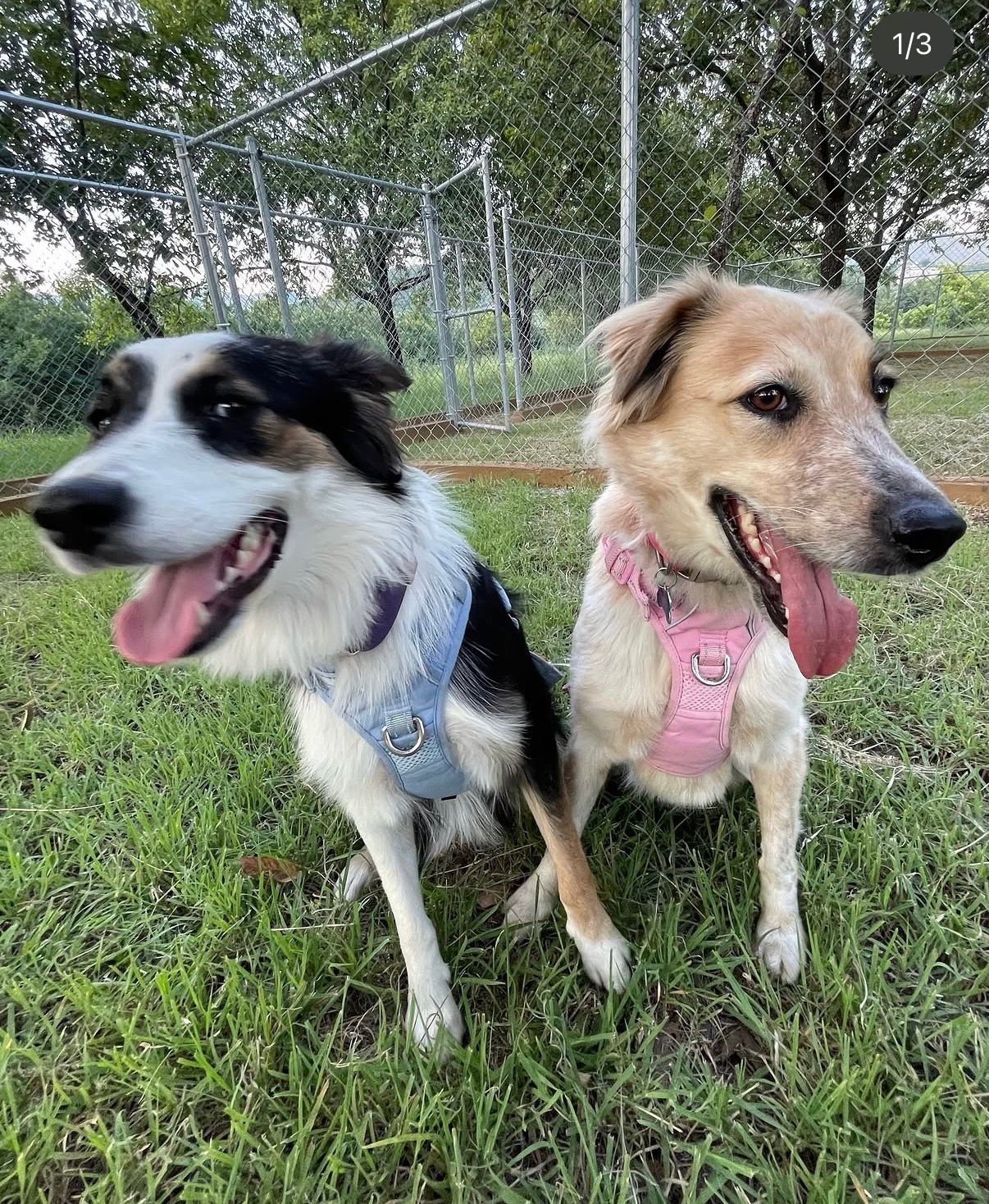 Perros enérgicos que disfrutan estar afuera, con sombra natural de los árboles y espacio para moverse libre.